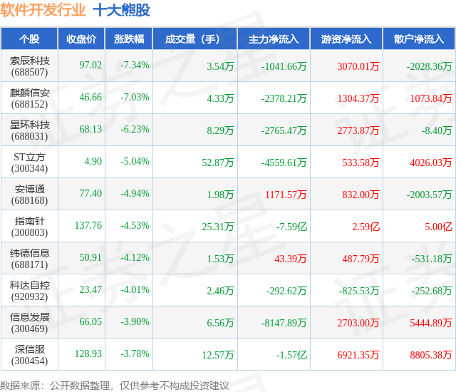 个股表现方面,软件开发行业当日领跌股为索辰科技(688507),该股当日报收97.02,下跌7.34%,成交量3.54万,主力资金净流出1041.66万元。麒麟信安(688152)以下跌7.03%紧随其后,该股当日成交量4.33万,主力资金净流出2378.21万元。除此之外,星环科技(688031)、ST立方(300344)、安博通(688168)均进入当日熊股之列。具体个股列表见下表: