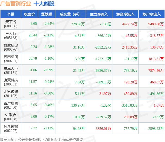 个股表现方面,广告营销行业当日领跌股为天下秀(600556),该股当日报收6.65,下跌2.64%,成交量228.68万,主力资金净流出1.39亿元。三人行(605168)以下跌2.13%紧随其后,该股当日成交量4.61万,主力资金净流出366.12万元。除此之外,智度股份(000676)、因赛集团(300781)、易点天下(301171)均进入当日熊股之列。具体个股列表见下表:
