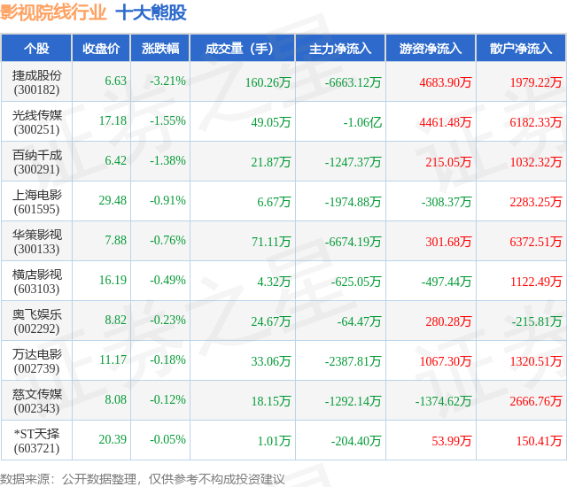 个股表现方面,影视院线行业当日领跌股为捷成股份(300182),该股当日报收6.63,下跌3.21%,成交量160.26万,主力资金净流出6663.12万元。光线传媒(300251)以下跌1.55%紧随其后,该股当日成交量49.05万,主力资金净流出1.06亿元。除此之外,百纳千成(300291)、上海电影(601595)、华策影视(300133)均进入当日熊股之列。具体个股列表见下表: