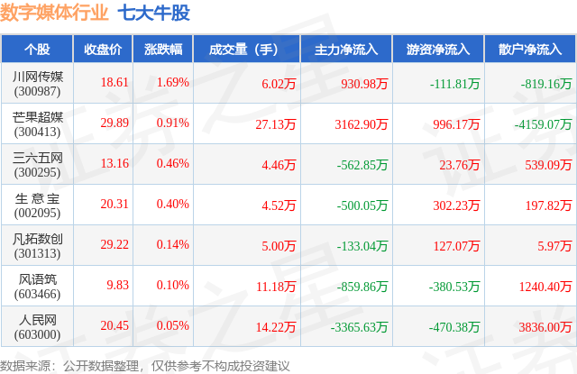 个股表现方面,数字媒体行业当日领涨股为川网传媒(300987),该股当日报收18.61,上涨1.69%,成交量6.02万,主力资金净流入930.98万元。芒果超媒(300413)以上涨0.91%紧随其后,该股当日成交量27.13万,主力资金净流入3162.9万元。除此之外,三六五网(300295)、生 意 宝(002095)、凡拓数创(301313)均进入当日牛股之列。具体个股列表见下表: