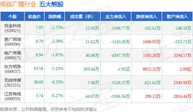 个股表现方面,电视广播行业当日领跌股为流金科技(920021),该股当日报收7.07,下跌2.75%,成交量15.93万,主力资金净流出1168.77万元。贵广网络(600996)以下跌2.3%紧随其后,该股当日成交量21.62万,主力资金净流出1143.2万元。除此之外,电广传媒(000917)、东方明珠(600637)、无线传媒(301551)均进入当日熊股之列。具体个股列表见下表: