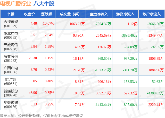 个股表现方面,电视广播行业当日领涨股为吉视传媒(601929),该股当日报收4.48,上涨10.07%,成交量1063.27万,主力资金净流出7554.32万元。湖北广电(000665)以上涨2.04%紧随其后,该股当日成交量93.9万,主力资金净流入2545.69万元。除此之外,天威视讯(002238)、海看股份(301262)、广西广电(600936)均进入当日牛股之列。具体个股列表见下表: