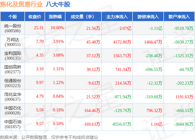 个股表现方面,炼化及贸易行业当日领涨股为统一股份(600506),该股当日报收25.31,上涨10.0%,成交量21.56万,主力资金净流入2.07亿元。万邦达(300055)以上涨3.91%紧随其后,该股当日成交量45.48万,主力资金净流入4172.8万元。除此之外,宝利国际(300135)、国创高新(002377)、恒通股份(603223)均进入当日牛股之列。具体个股列表见下表: