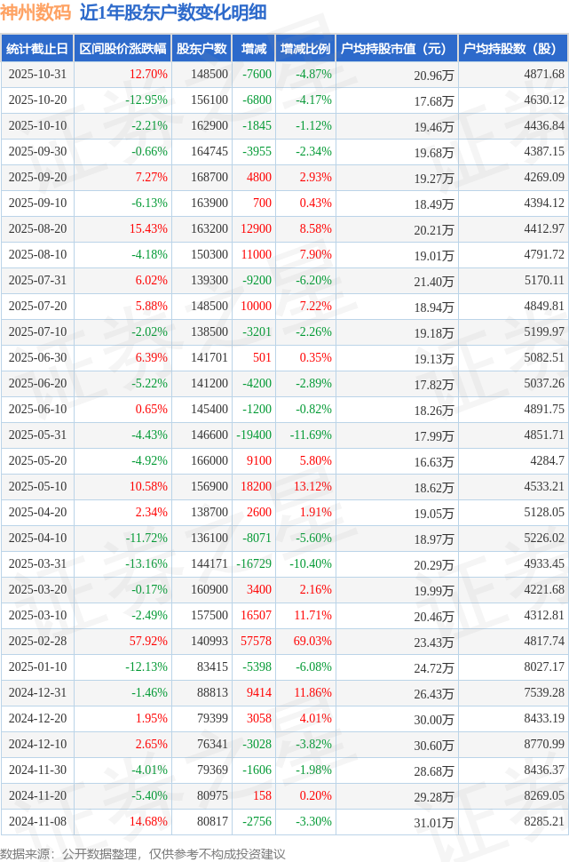 从股价来看,2025年10月20日至2025年10月31日,神州数码区间涨幅为12.7%,在此期间股东户数减少7600.0户,减幅为4.87%。