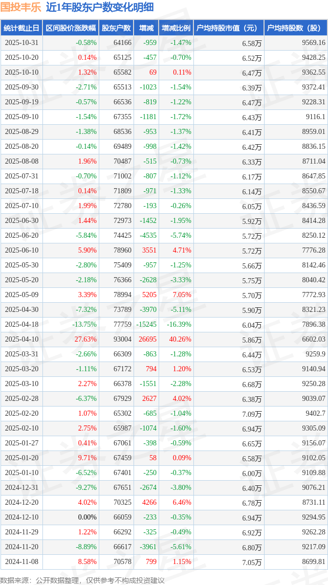 从股价来看,2025年10月20日至2025年10月31日,国投丰乐区间跌幅为0.58%,在此期间股东户数减少959.0户,减幅为1.47%。