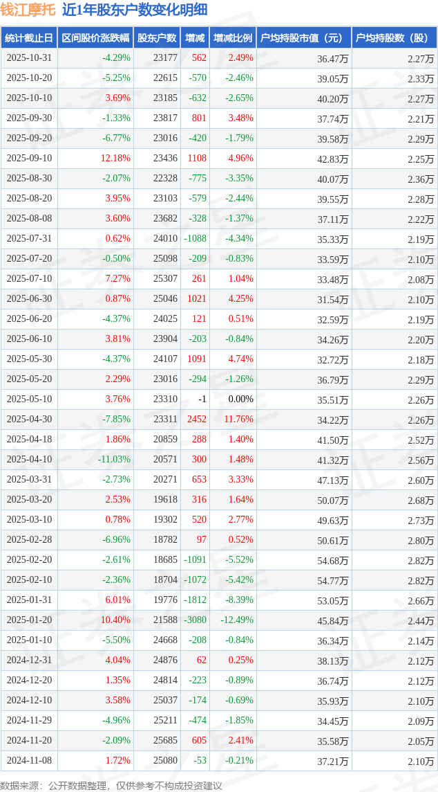 从股价来看,2025年10月20日至2025年10月31日,钱江摩托区间跌幅为4.29%,在此期间股东户数增加562.0户,增幅为2.49%。