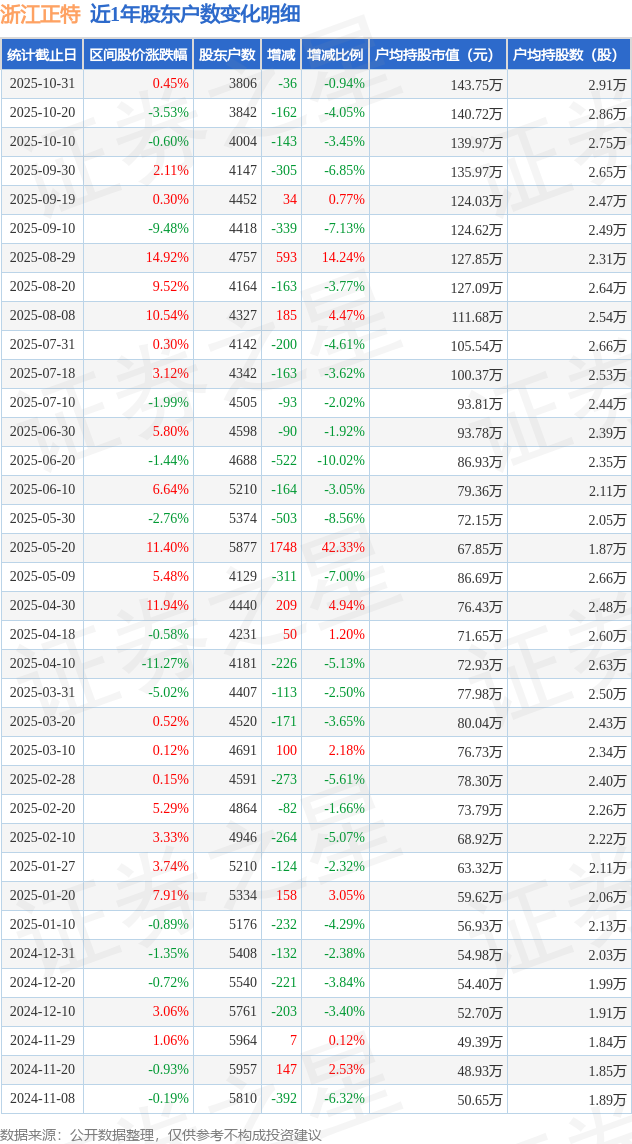 从股价来看,2025年10月20日至2025年10月31日,浙江正特区间涨幅为0.45%,在此期间股东户数减少36.0户,减幅为0.94%。