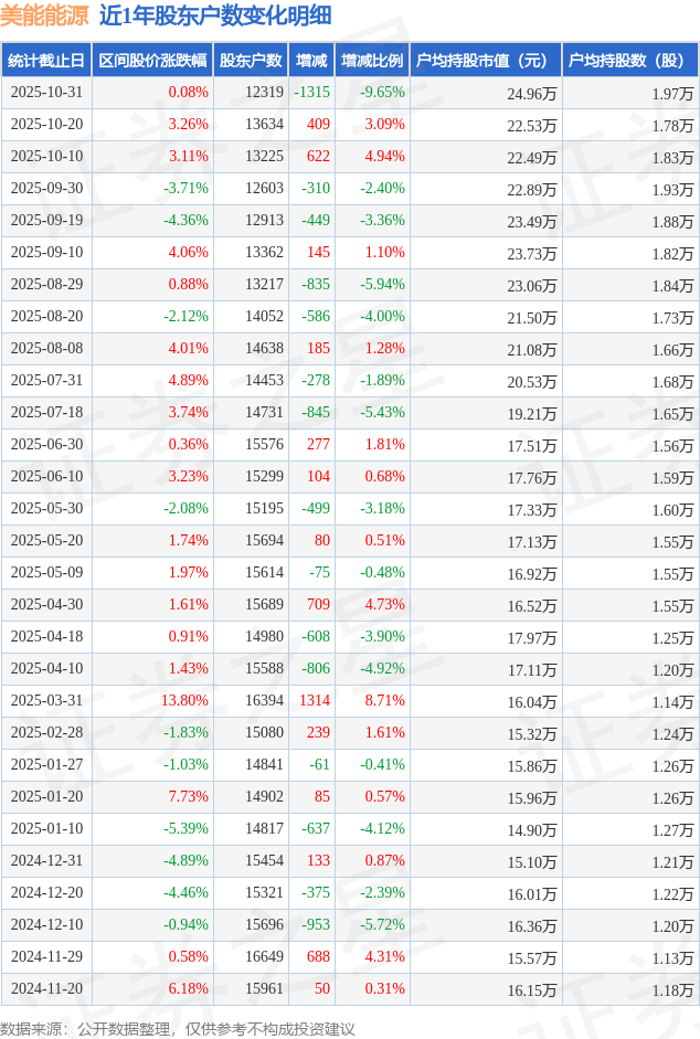 从股价来看,2025年10月20日至2025年10月31日,美能能源区间涨幅为0.08%,在此期间股东户数减少1315.0户,减幅为9.65%。