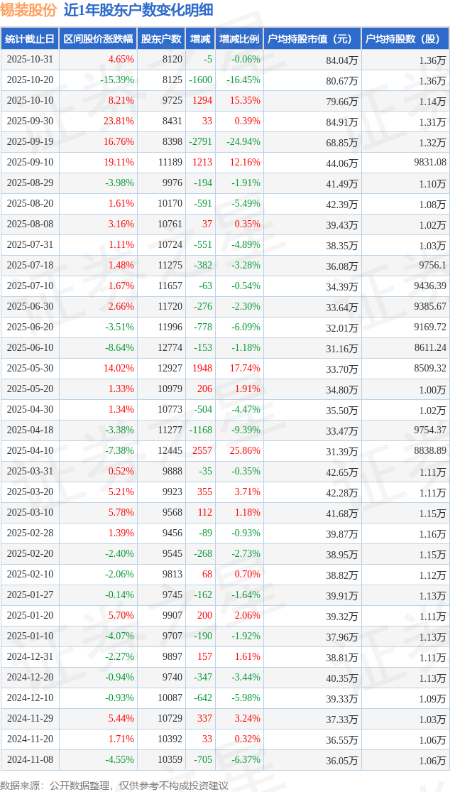 从股价来看,2025年10月20日至2025年10月31日,锡装股份区间涨幅为4.65%,在此期间股东户数减少5.0户,减幅为0.06%。