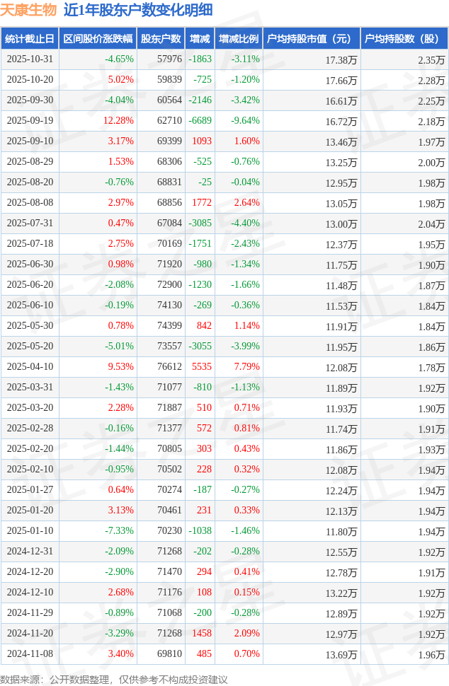 从股价来看,2025年10月20日至2025年10月31日,天康生物区间跌幅为4.65%,在此期间股东户数减少1863.0户,减幅为3.11%。