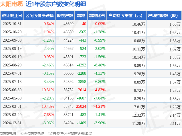 从股价来看,2025年10月20日至2025年10月31日,太阳电缆区间涨幅为0.64%,在此期间股东户数增加40.0户,增幅为0.09%。