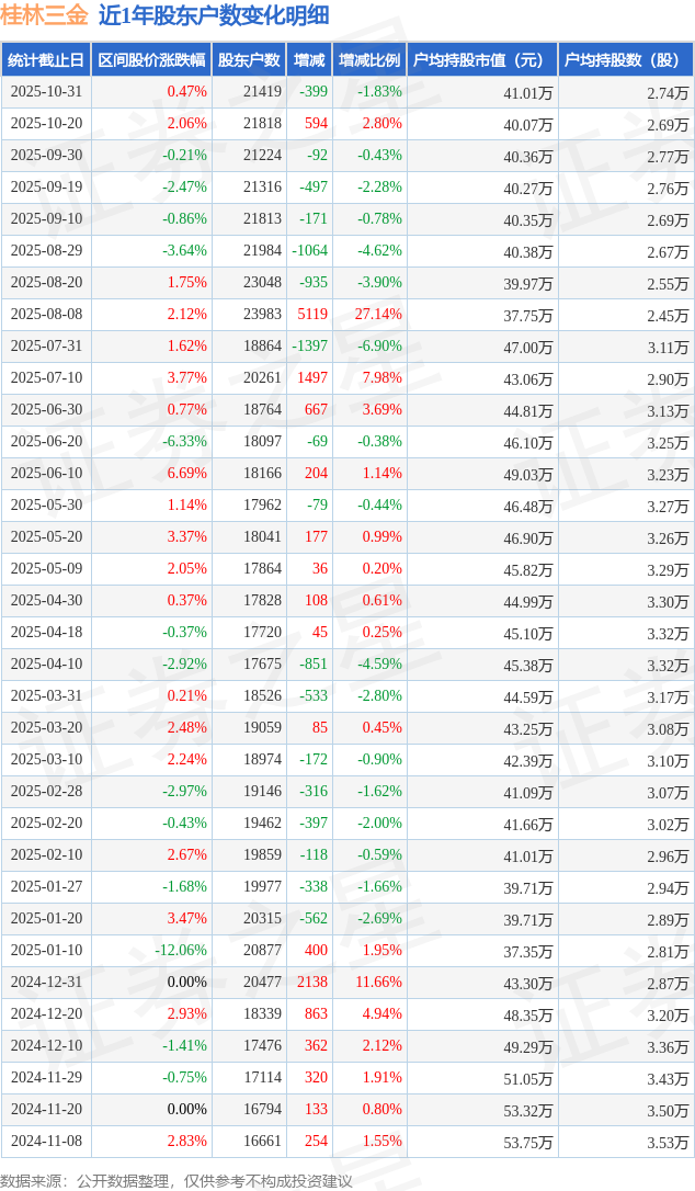 从股价来看,2025年10月20日至2025年10月31日,桂林三金区间涨幅为0.47%,在此期间股东户数减少399.0户,减幅为1.83%。