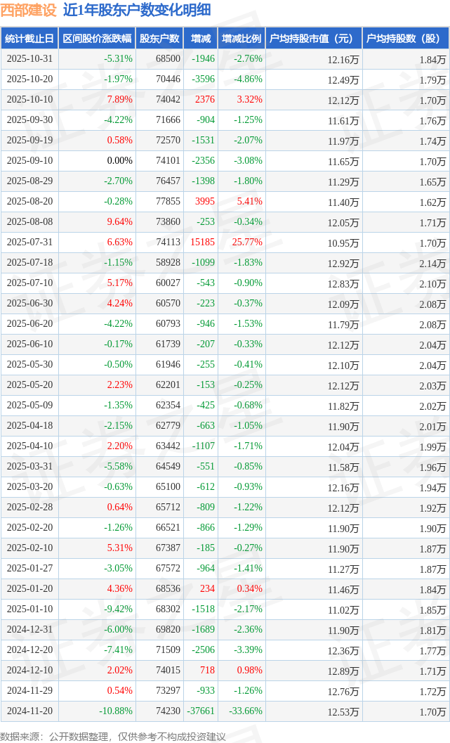 从股价来看,2025年10月20日至2025年10月31日,西部建设区间跌幅为5.31%,在此期间股东户数减少1946.0户,减幅为2.76%。