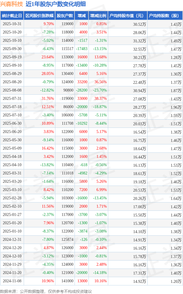 从股价来看,2025年10月20日至2025年10月31日,兴森科技区间涨幅为9.7%,在此期间股东户数增加1000.0户,增幅为0.85%。