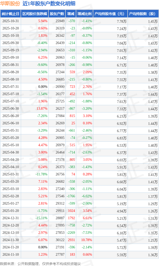 从股价来看,2025年10月20日至2025年10月31日,华斯股份区间涨幅为5.94%,在此期间股东户数减少370.0户,减幅为1.41%。