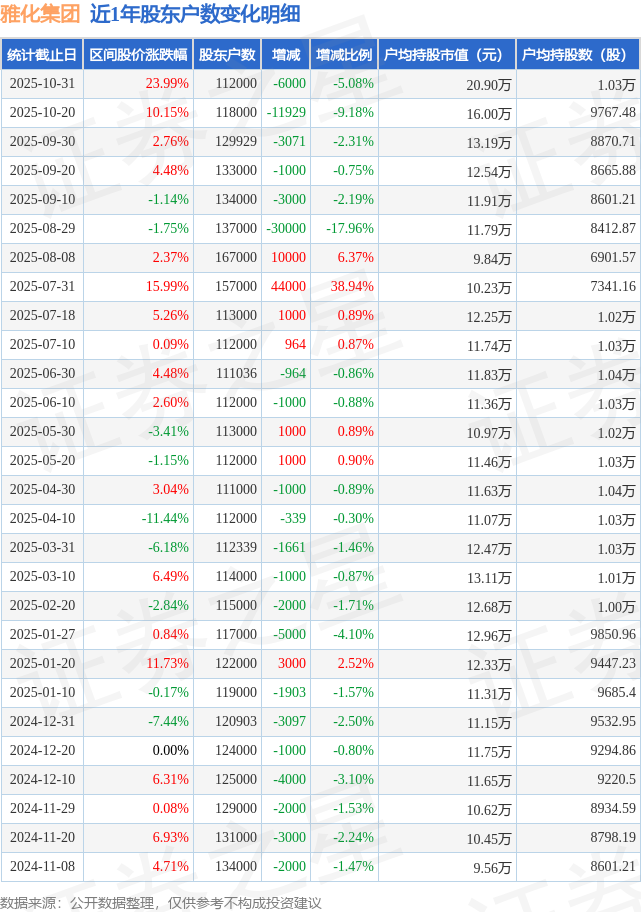 从股价来看,2025年10月20日至2025年10月31日,雅化集团区间涨幅为23.99%,在此期间股东户数减少6000.0户,减幅为5.08%。