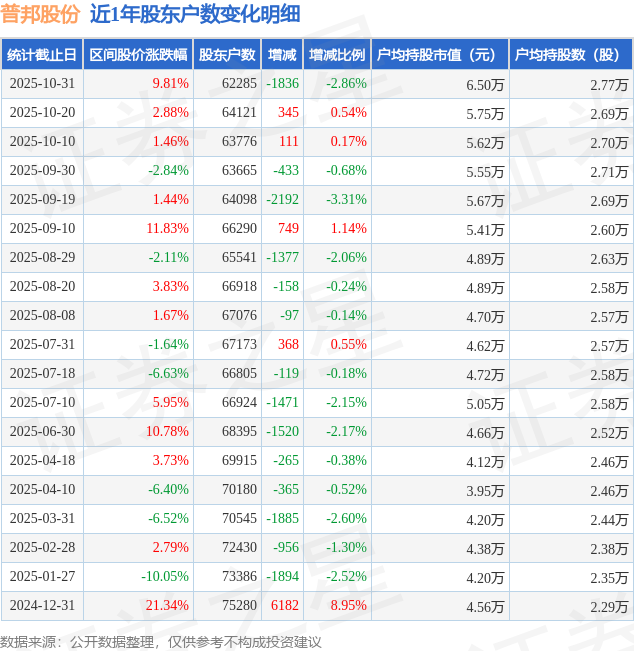 从股价来看,2025年10月20日至2025年10月31日,普邦股份区间涨幅为9.81%,在此期间股东户数减少1836.0户,减幅为2.86%。