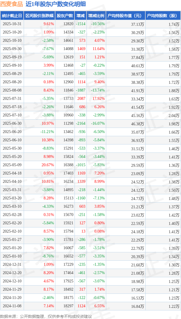 从股价来看,2025年10月20日至2025年10月31日,西麦食品区间涨幅为9.61%,在此期间股东户数减少1514.0户,减幅为10.56%。