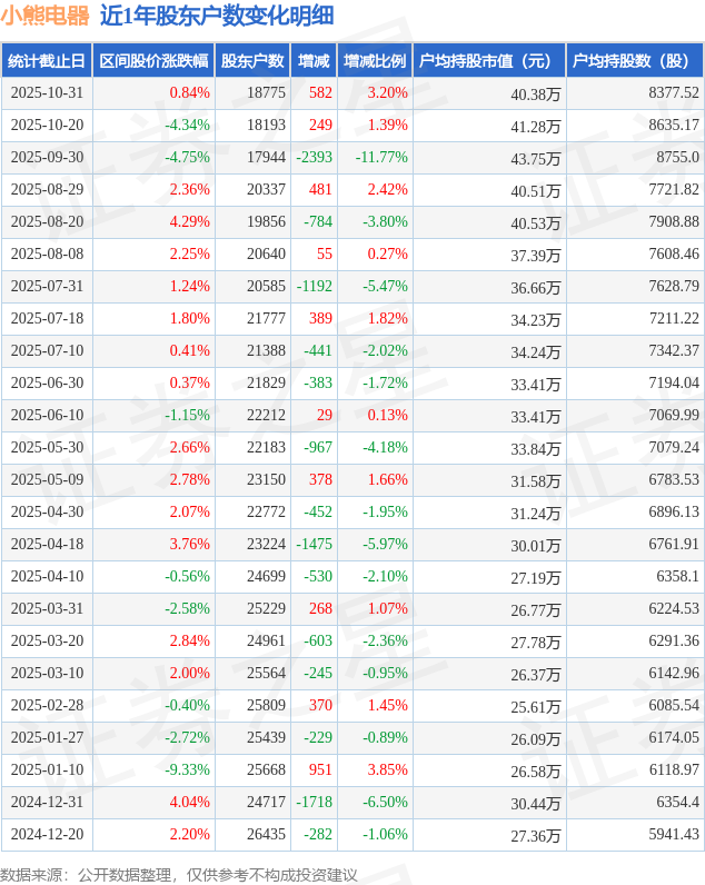 从股价来看,2025年10月20日至2025年10月31日,小熊电器区间涨幅为0.84%,在此期间股东户数增加582.0户,增幅为3.2%。