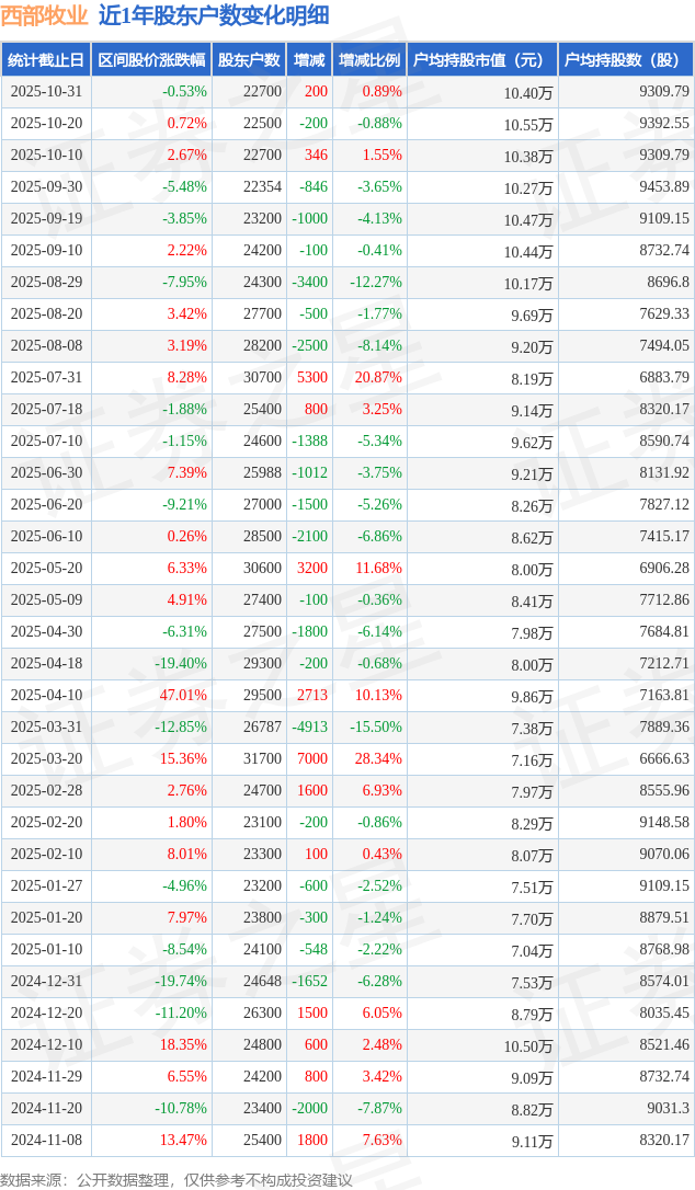 从股价来看,2025年10月20日至2025年10月31日,西部牧业区间跌幅为0.53%,在此期间股东户数增加200.0户,增幅为0.89%。