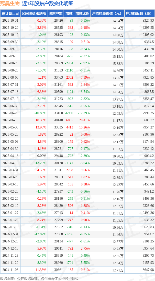 从股价来看,2025年10月20日至2025年10月31日,冠昊生物区间涨幅为0.38%,在此期间股东户数减少99.0户,减幅为0.35%。