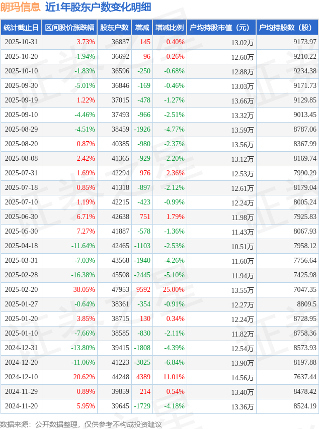 从股价来看,2025年10月20日至2025年10月31日,朗玛信息区间涨幅为3.73%,在此期间股东户数增加145.0户,增幅为0.4%。