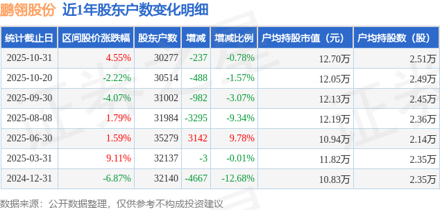 从股价来看,2025年10月20日至2025年10月31日,鹏翎股份区间涨幅为4.55%,在此期间股东户数减少237.0户,减幅为0.78%。