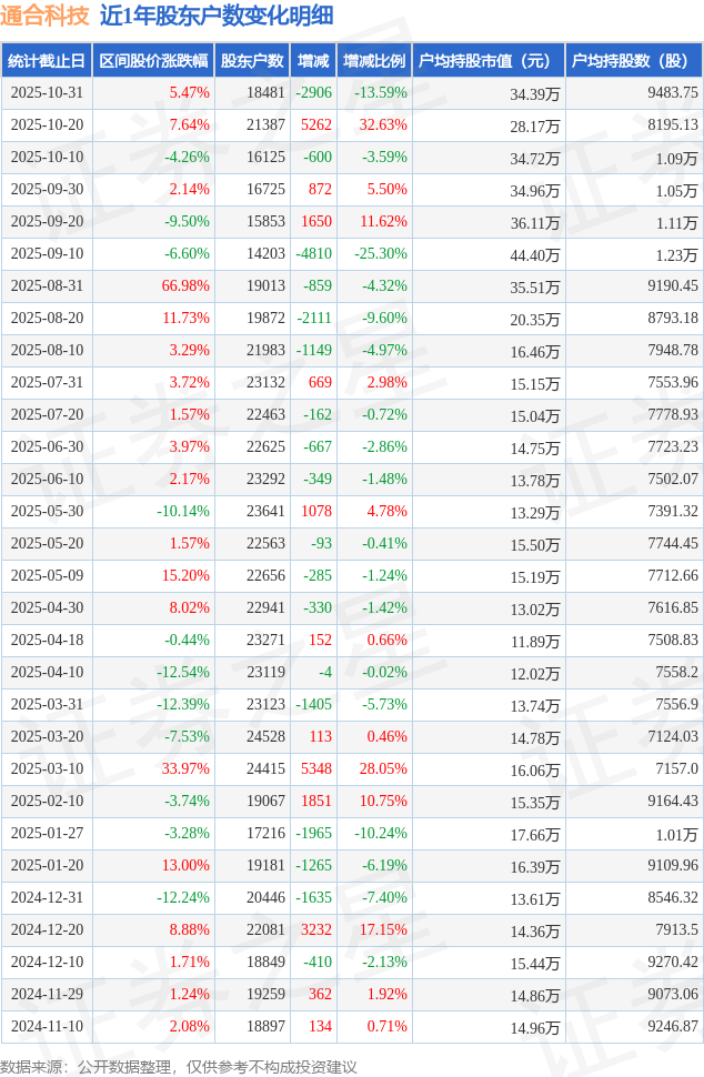 从股价来看,2025年10月20日至2025年10月31日,通合科技区间涨幅为5.47%,在此期间股东户数减少2906.0户,减幅为13.59%。