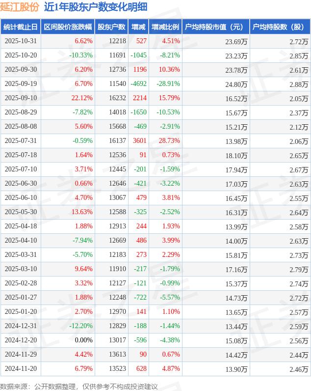 从股价来看,2025年10月20日至2025年10月31日,延江股份区间涨幅为6.62%,在此期间股东户数增加527.0户,增幅为4.51%。