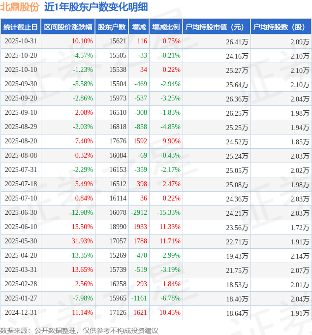 从股价来看,2025年10月20日至2025年10月31日,北鼎股份区间涨幅为10.1%,在此期间股东户数增加116.0户,增幅为0.75%。