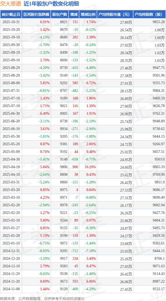 从股价来看,2025年10月20日至2025年10月31日,交大思诺区间涨幅为6.91%,在此期间股东户数增加151.0户,增幅为1.74%。