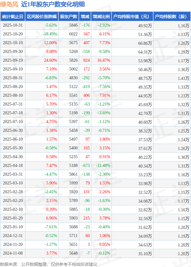 从股价来看,2025年10月20日至2025年10月31日,绿岛风区间跌幅为5.63%,在此期间股东户数减少176.0户,减幅为2.92%。