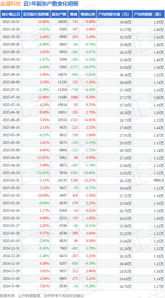 从股价来看,2025年10月20日至2025年10月31日,金道科技区间涨幅为16.6%,在此期间股东户数增加743.0户,增幅为8.0%。