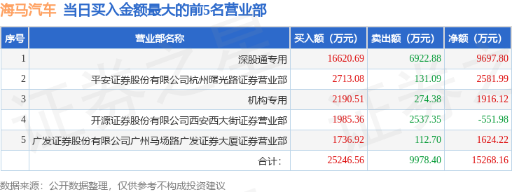 证券之星消息,沪深交易所2025年11月4日公布的交易公开信息显示,海马汽车(000572)因日涨幅偏离值达到7%的前5只证券登上龙虎榜。此次是近5个交易日内第2次上榜。