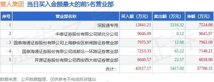 证券之星消息,沪深交易所2025年11月4日公布的交易公开信息显示,雪人集团(002639)因日涨幅偏离值达到7%的前5只证券登上龙虎榜。此次是近5个交易日内第1次上榜。