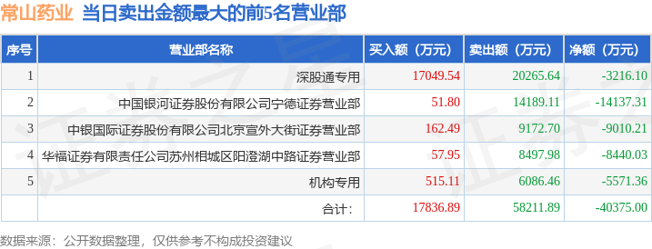 证券之星消息,沪深交易所2025年11月4日公布的交易公开信息显示,常山药业(300255)因日跌幅达到15%的前5只证券登上龙虎榜。此次是近5个交易日内第1次上榜。