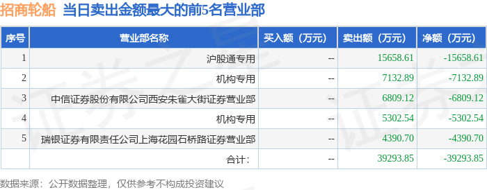 证券之星消息,沪深交易所2025年11月4日公布的交易公开信息显示,招商轮船(601872)因有价格涨跌幅限制的日收盘价格跌幅偏离值达到7%的前五只证券登上龙虎榜。此次是近5个交易日内第2次上榜。