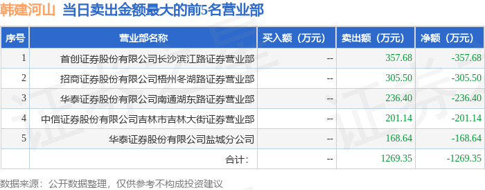证券之星消息,沪深交易所2025年11月4日公布的交易公开信息显示,韩建河山(603616)因有价格涨跌幅限制的日收盘价格涨幅偏离值达到7%的前五只证券登上龙虎榜。此次是近5个交易日内第1次上榜。