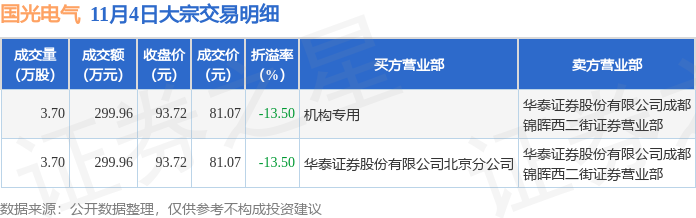 证券之星消息,11月4日国光电气发生大宗交易,交易数据如下: