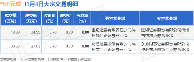 证券之星消息,11月4日*ST元成发生大宗交易,交易数据如下: