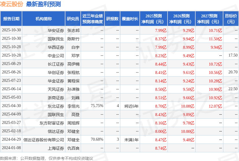 凌云股份2025年三季报显示,前三季度公司主营收入140.7亿元,同比上升5.41%;归母净利润5.88亿元,同比上升17.47%;扣非净利润5.04亿元,同比上升16.37%;其中2025年第三季度,公司单季度主营收入48.09亿元,同比上升9.05%;单季度归母净利润1.55亿元,同比上升52.86%;单季度扣非净利润1.31亿元,同比上升60.7%;负债率50.18%,投资收益6576.8万元,财务费用-5283.36万元,毛利率16.4%。