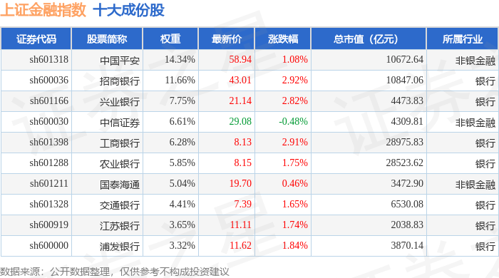 证券之星消息,11月4日,上证金融(000038)指数报收于5827.66点,涨1.51%,成交505.95亿元,换手率0.35%。当日该指数成份股中,上涨的有22家,中信银行以3.31%的涨幅领涨,下跌的有7家,保利发展以1.23%的跌幅领跌。