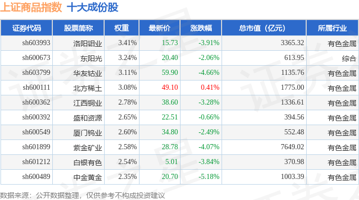 证券之星消息,11月4日,上证商品(000066)指数报收于3360.38点,跌1.83%,成交650.59亿元,换手率1.13%。当日该指数成份股中,上涨的有11家,包钢股份以5.26%的涨幅领涨,下跌的有37家,扬农化工以7.14%的跌幅领跌。