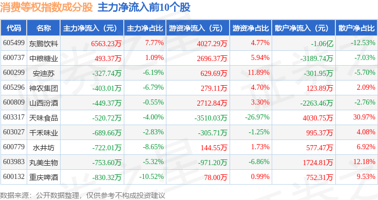 资金流向方面,消费等权(000074)指数成份股当日主力资金净流出合计10.44亿元,游资资金净流入合计6.41亿元,散户资金净流入合计4.04亿元。成份股资金流向详情见下表: