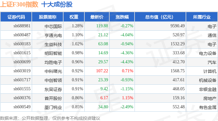 证券之星消息,11月4日,上证F300(000099)指数报收于9088.67点,跌1.04%,成交1736.46亿元,换手率1.59%。当日该指数成份股中,上涨的有82家,厦门银行以5.92%的涨幅领涨,下跌的有204家,杉杉股份以7.86%的跌幅领跌。