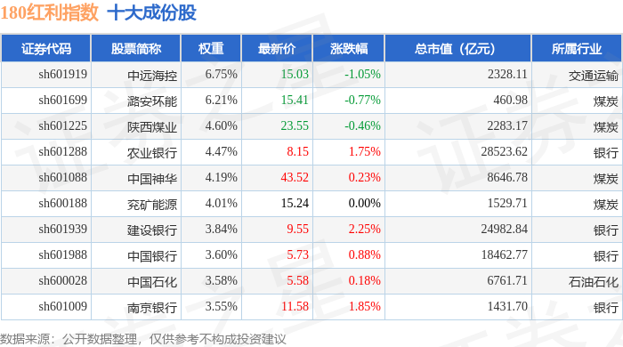 证券之星消息,11月4日,180红利(000149)指数报收于4160.65点,涨0.9%,成交479.64亿元,换手率0.32%。当日该指数成份股中,上涨的有22家,中信银行以3.31%的涨幅领涨,下跌的有7家,海螺水泥以1.07%的跌幅领跌。