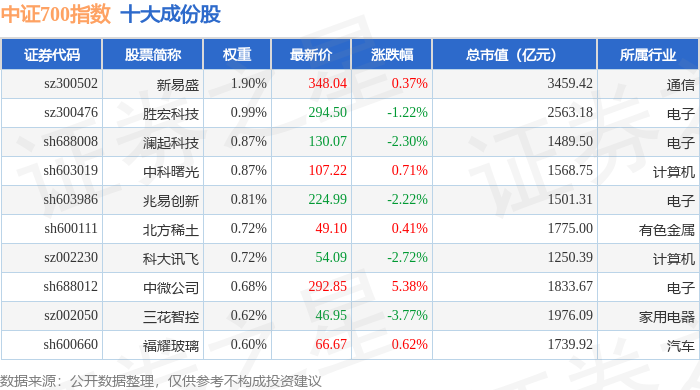 证券之星消息,11月4日,中证700(000907)指数报收于6334.85点,跌1.35%,成交5866.03亿元,换手率1.61%。当日该指数成份股中,上涨的有132家,中微公司以5.38%的涨幅领涨,下跌的有552家,招商轮船以9.54%的跌幅领跌。