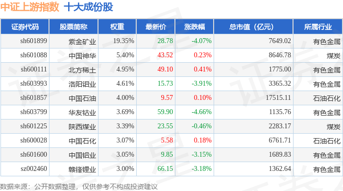 中证上游(000961)指数十大成份股详情如下: