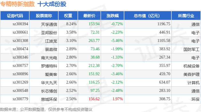 专精特新(399267)指数十大成份股详情如下: