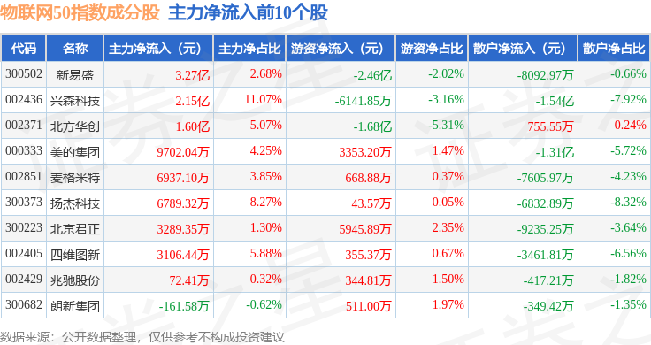 资金流向方面,物联网50(399285)指数成份股当日主力资金净流出合计52.03亿元,游资资金净流入合计18.52亿元,散户资金净流入合计33.51亿元。成份股资金流向详情见下表: